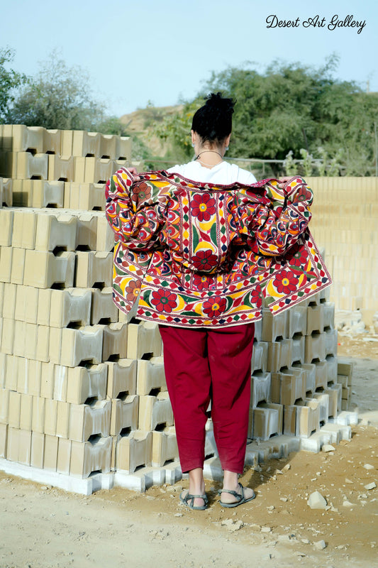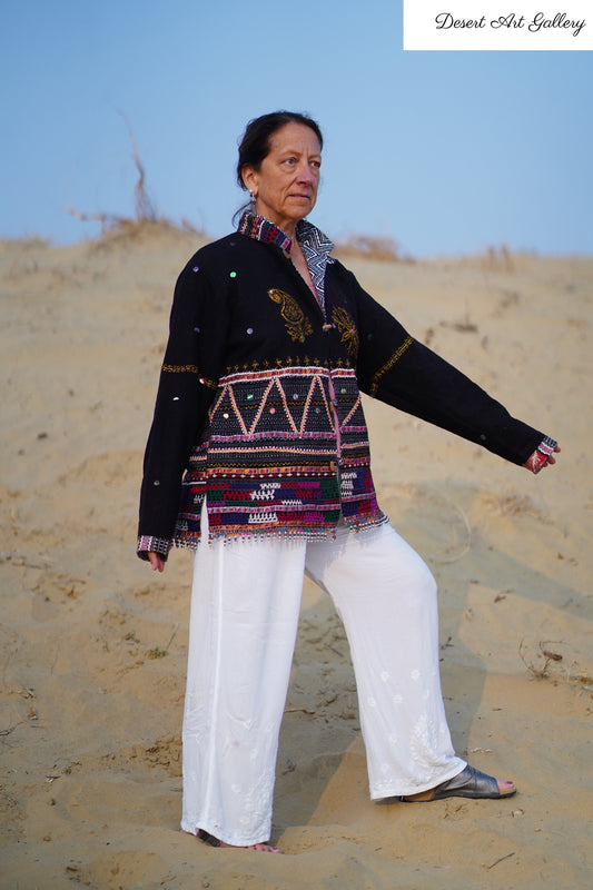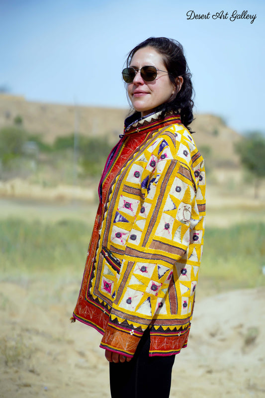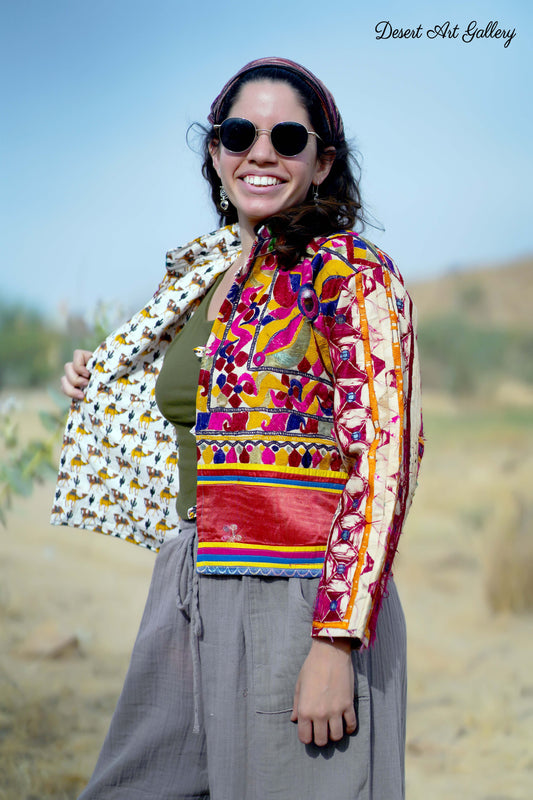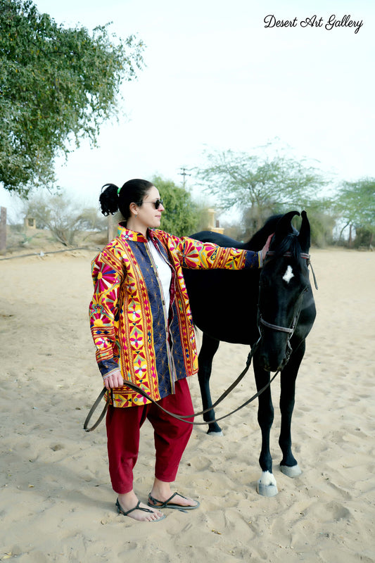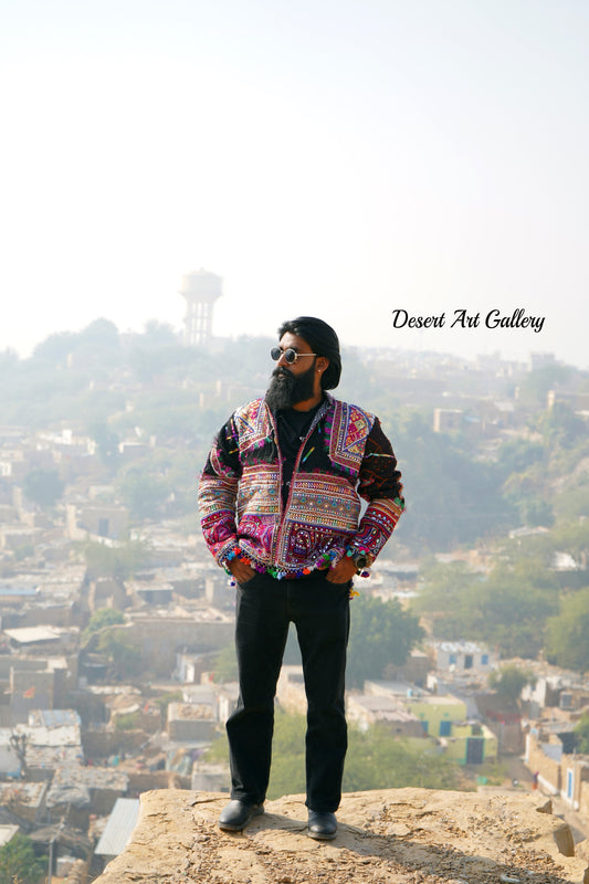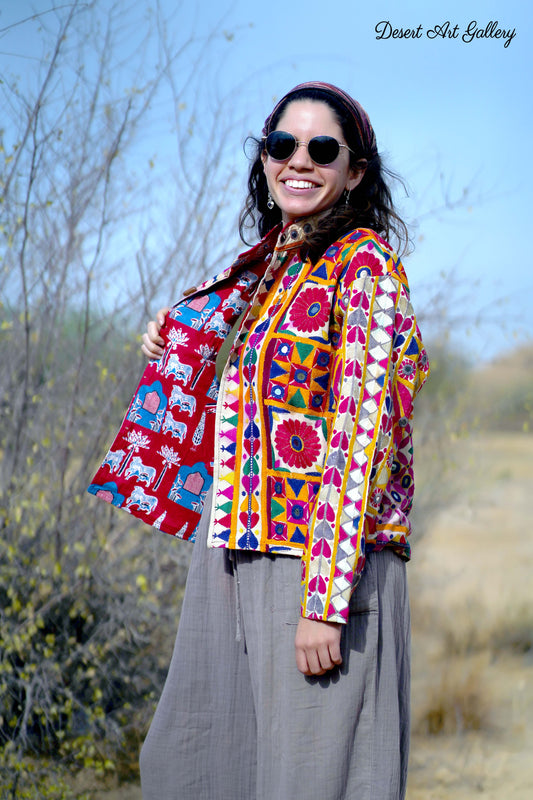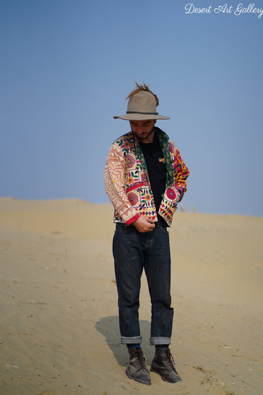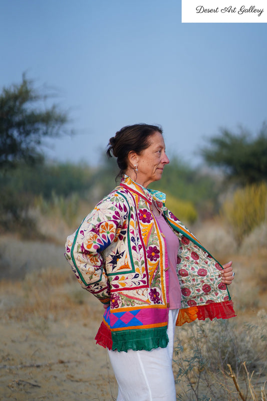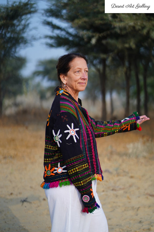 Vintage Rabari fabrics we sourced from the villages of the Banjara tribes in the Kutch region of Gujarat are repurposed into warm, practical jackets. Lovingly hand-embroidered, each of these tells a story of its own.