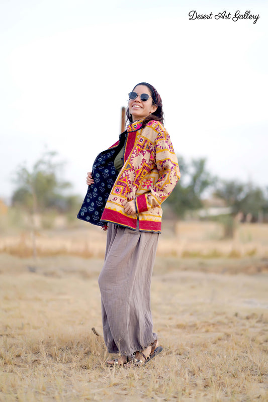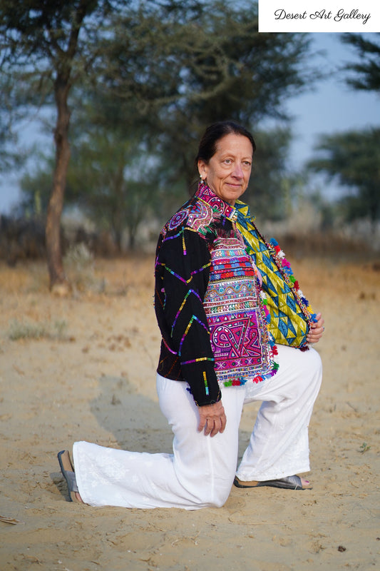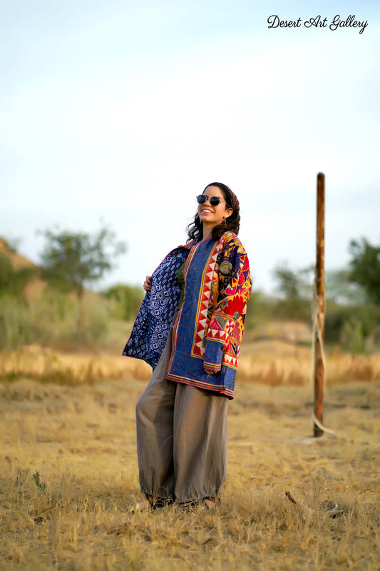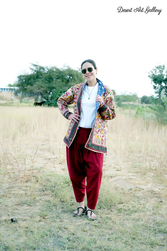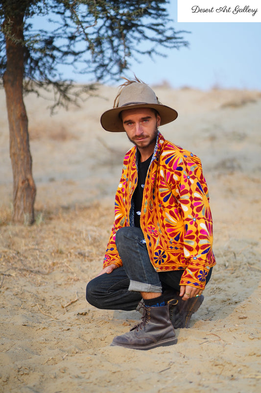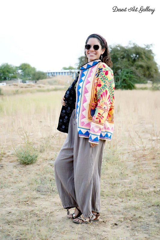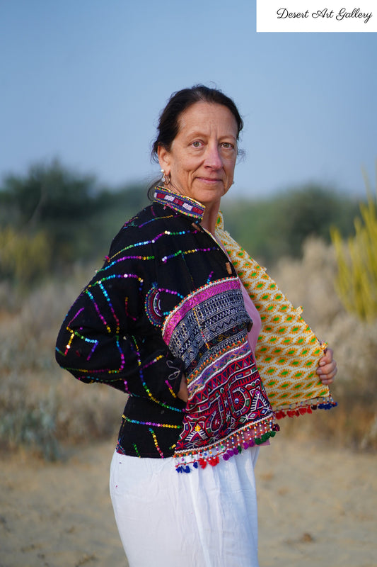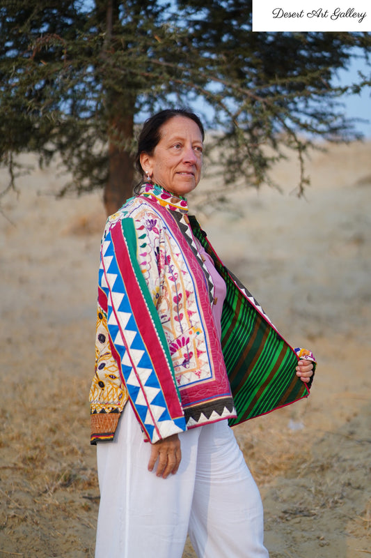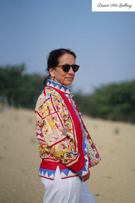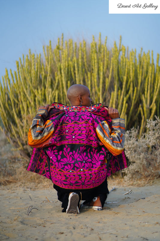 Vintage Rabari fabrics we sourced from the villages of the Banjara tribes in the Kutch region of Gujarat are repurposed into warm, practical jackets. Lovingly hand-embroidered, each of these tells a story of its own.
