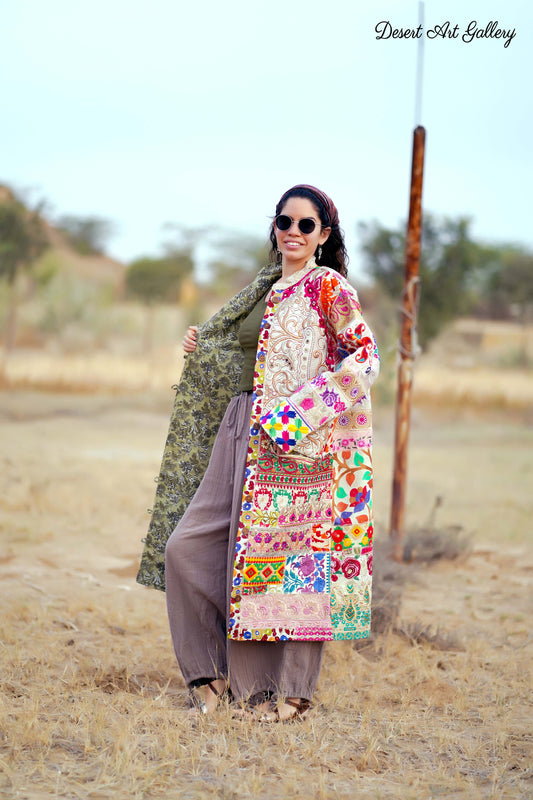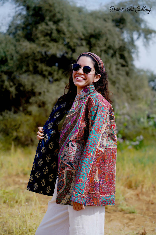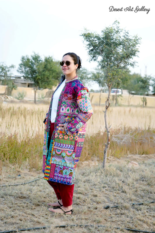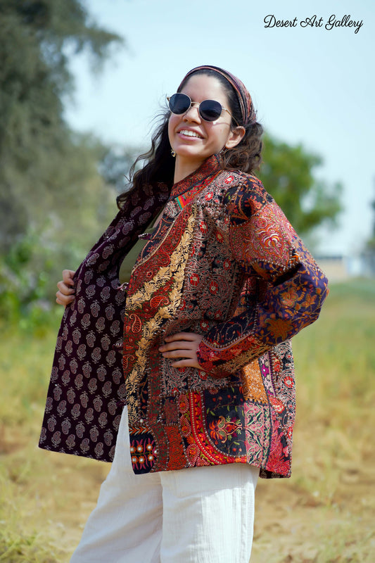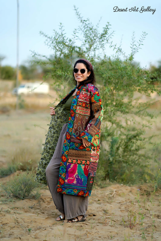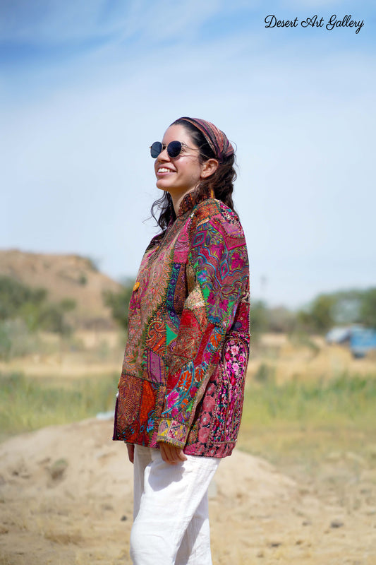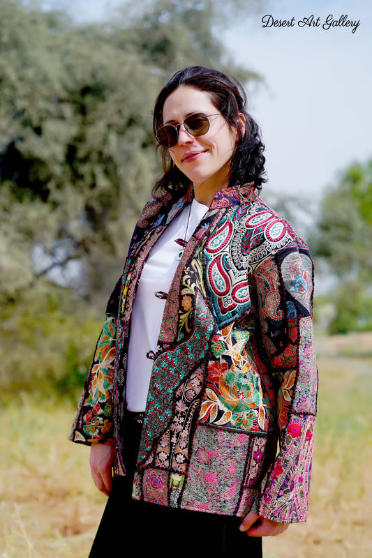 These one of a kind jackets are handmade by people of Rajasthan of re-purposed fabrics. They feature intricate and stunning hand and machine embroidered unique designs.