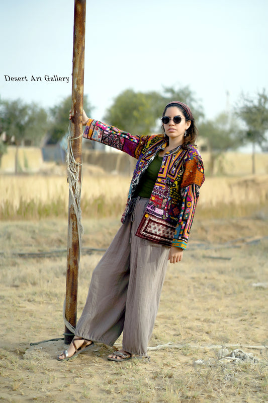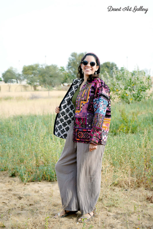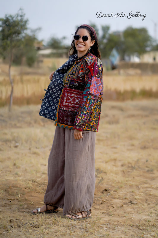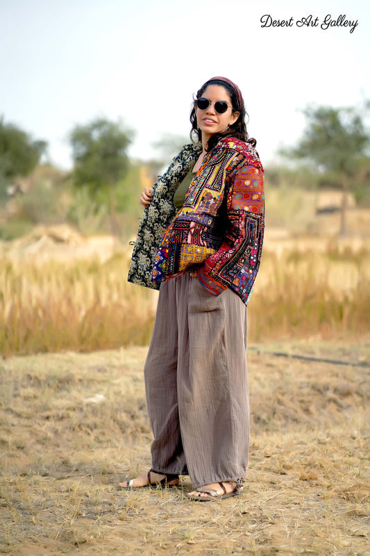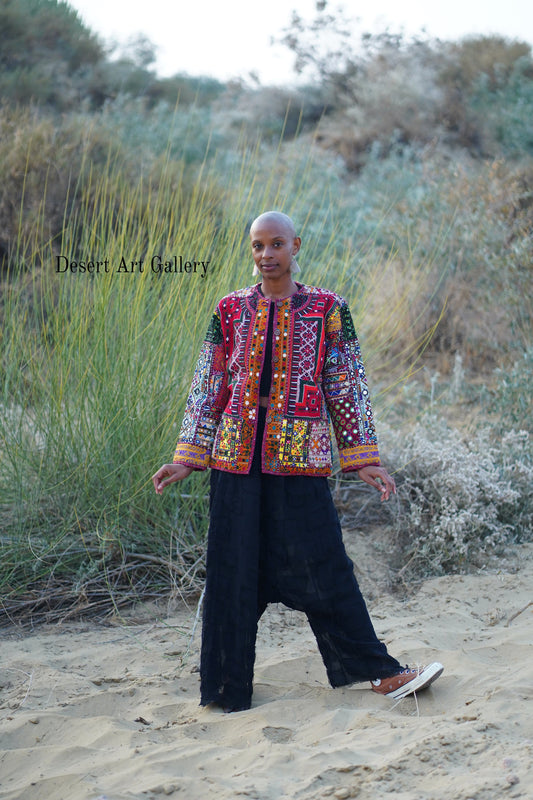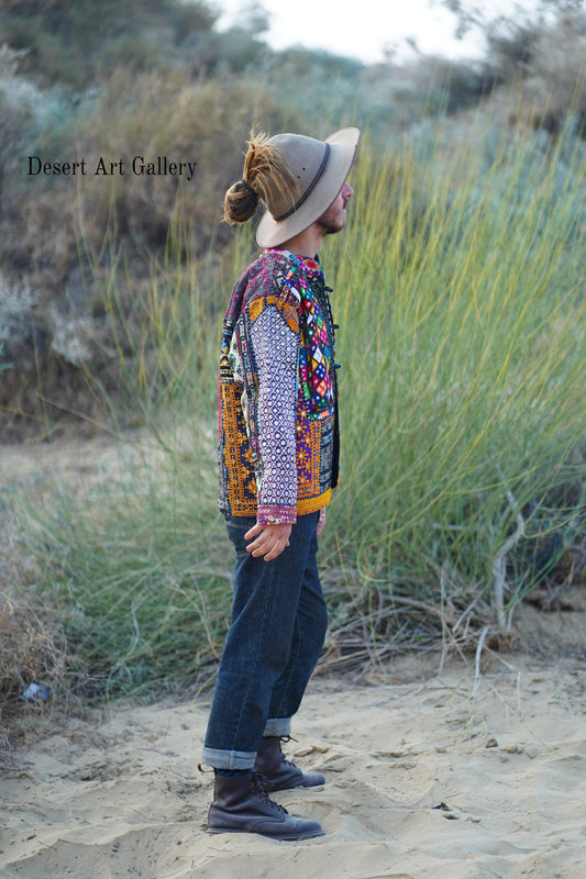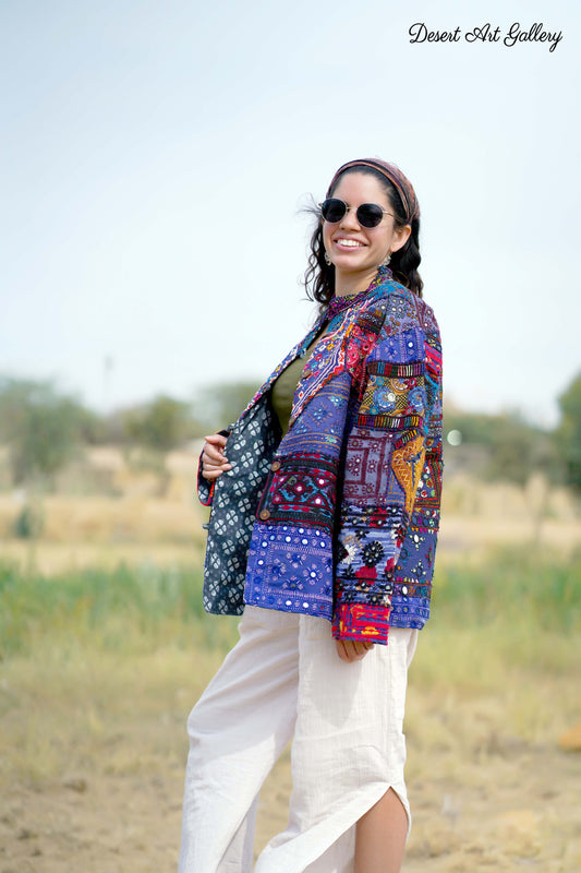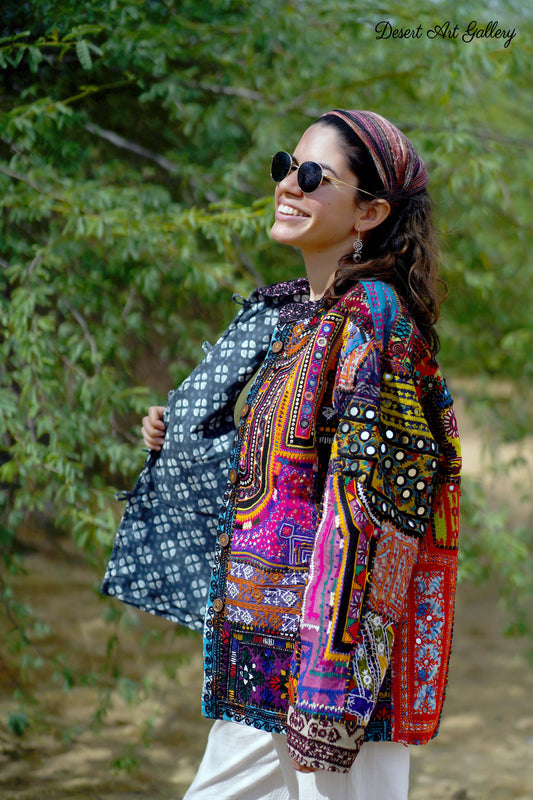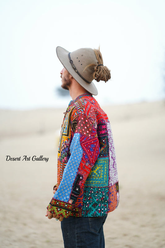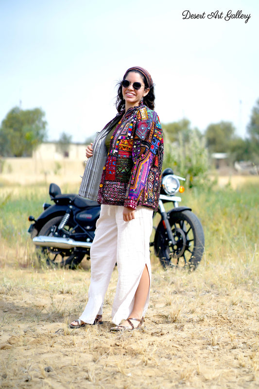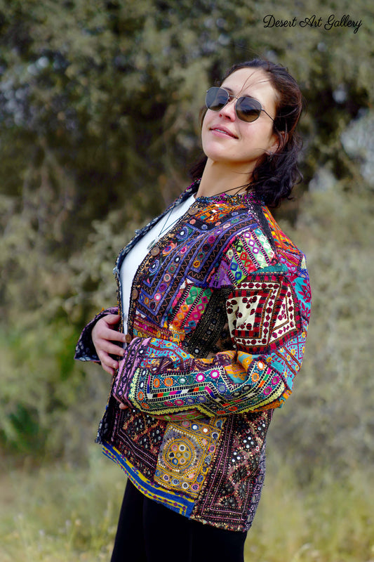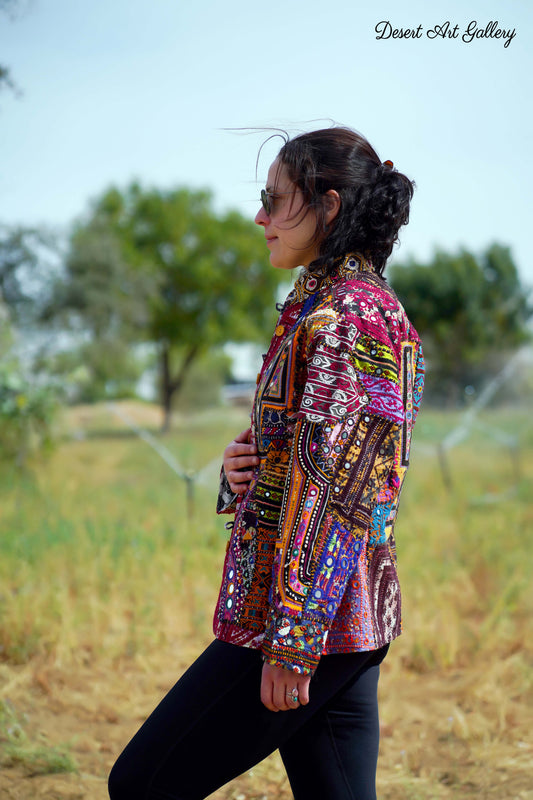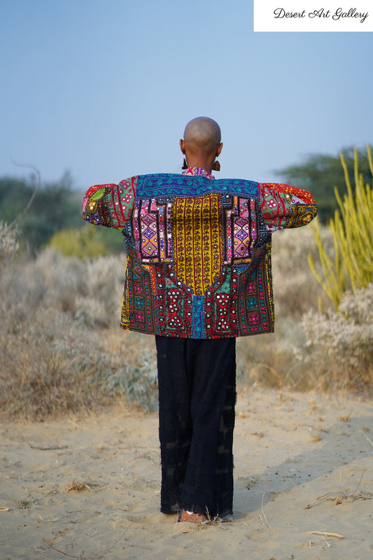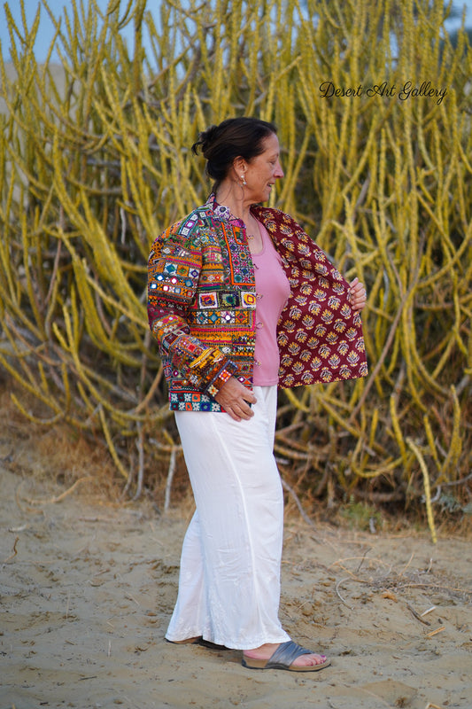 These one of a kind jackets are handmade by the nomadic Banjara people of Rajasthan of re-purposed fabrics. They feature intricate and stunning hand embroidered tribal designs.